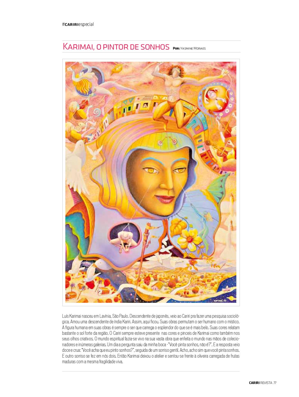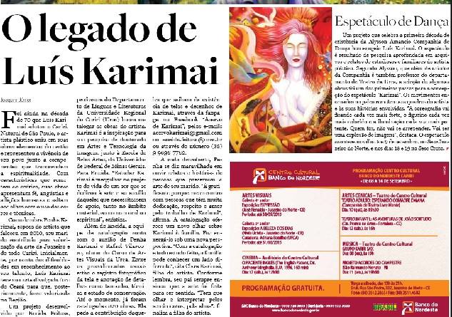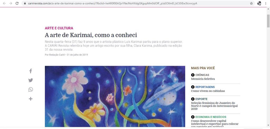 Jornalista atuante na região do Cariri com foco na arte, na cultura e no turismo. Desde 2016 se dedica a catalogação das obras e divulgação do artista plástico Luis Karimai.