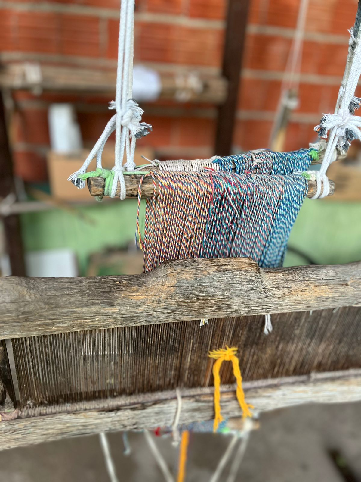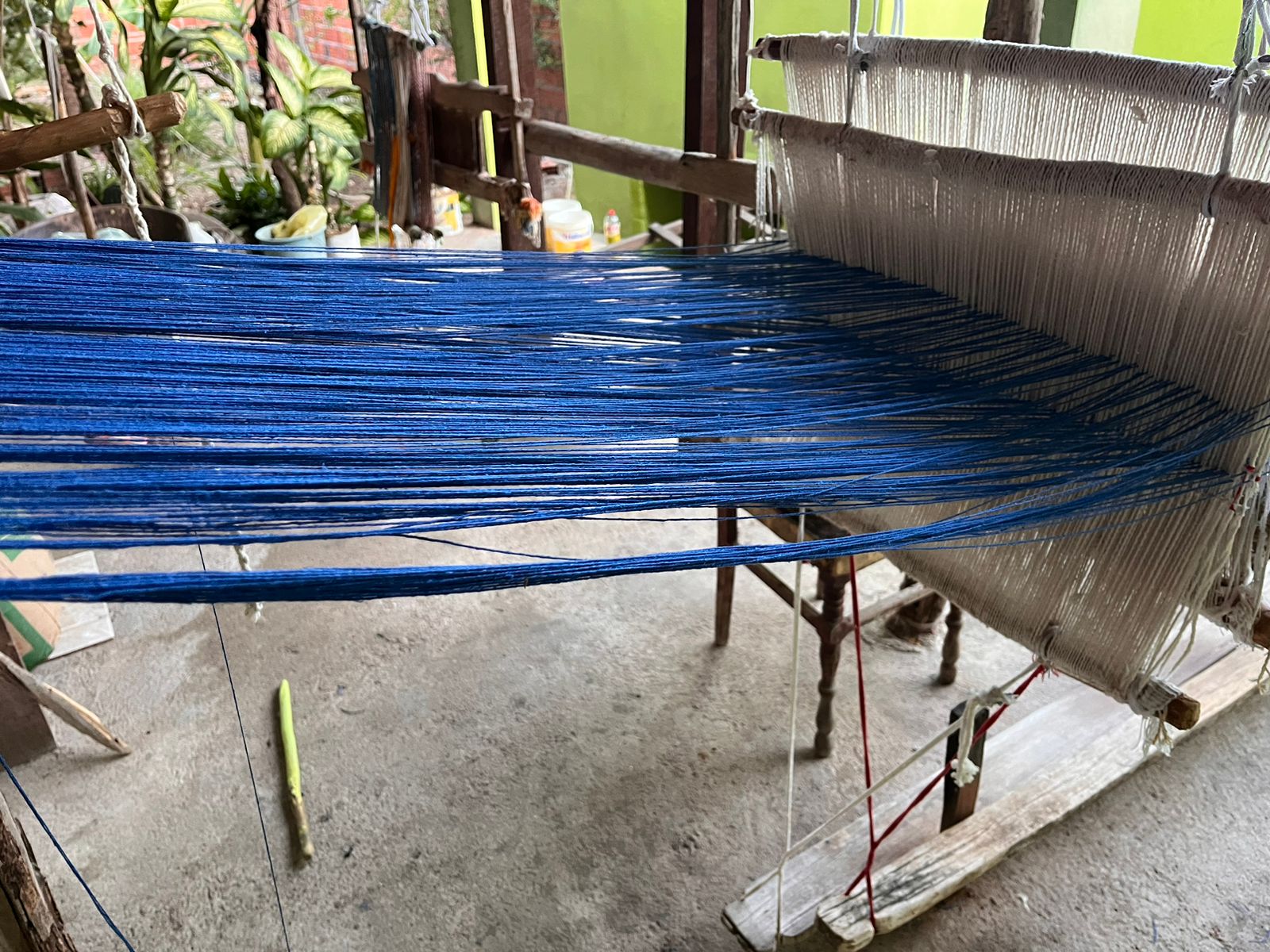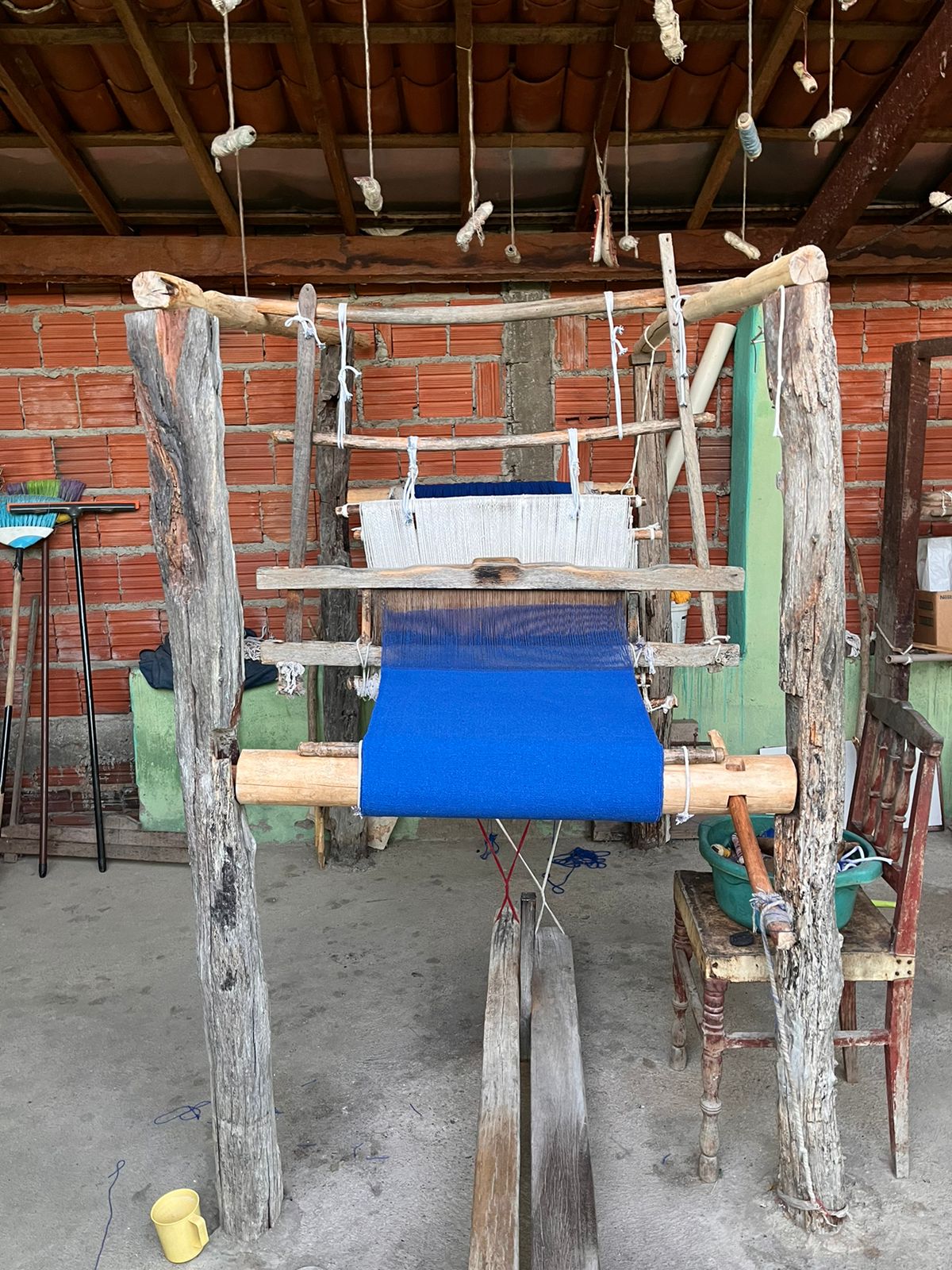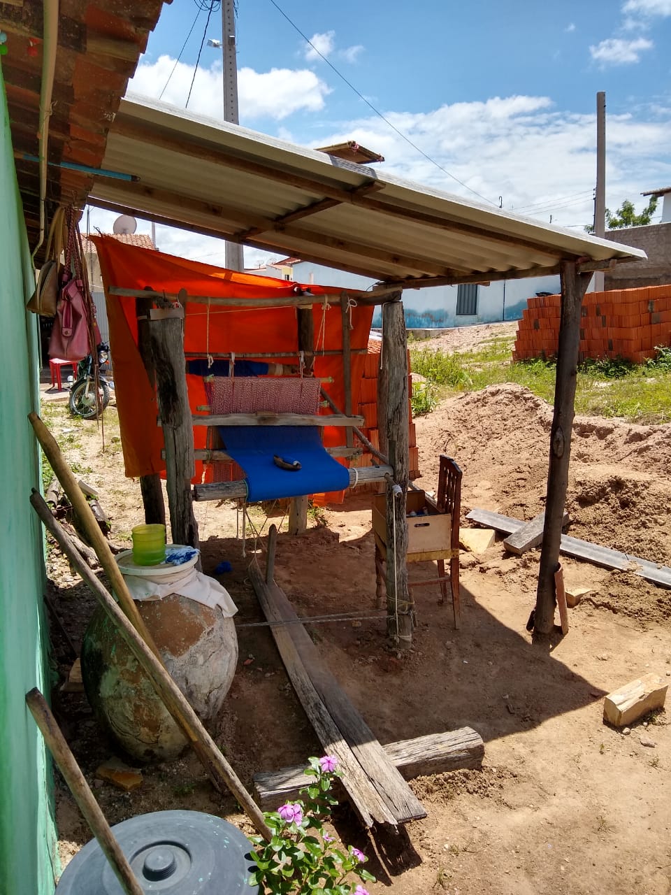 No quintal, repousam as partes do tear que tanto contribuíram para sua arte: liço, queixa, braço, orgo, pente, rasteira, cartel, canela e lançadeira. Com carinho e espontaneidade, Dinha brinca, afirmando que as madeiras de Ipê e Peroba Rosa que as compõem são mais antigas que suas próprias lembranças.