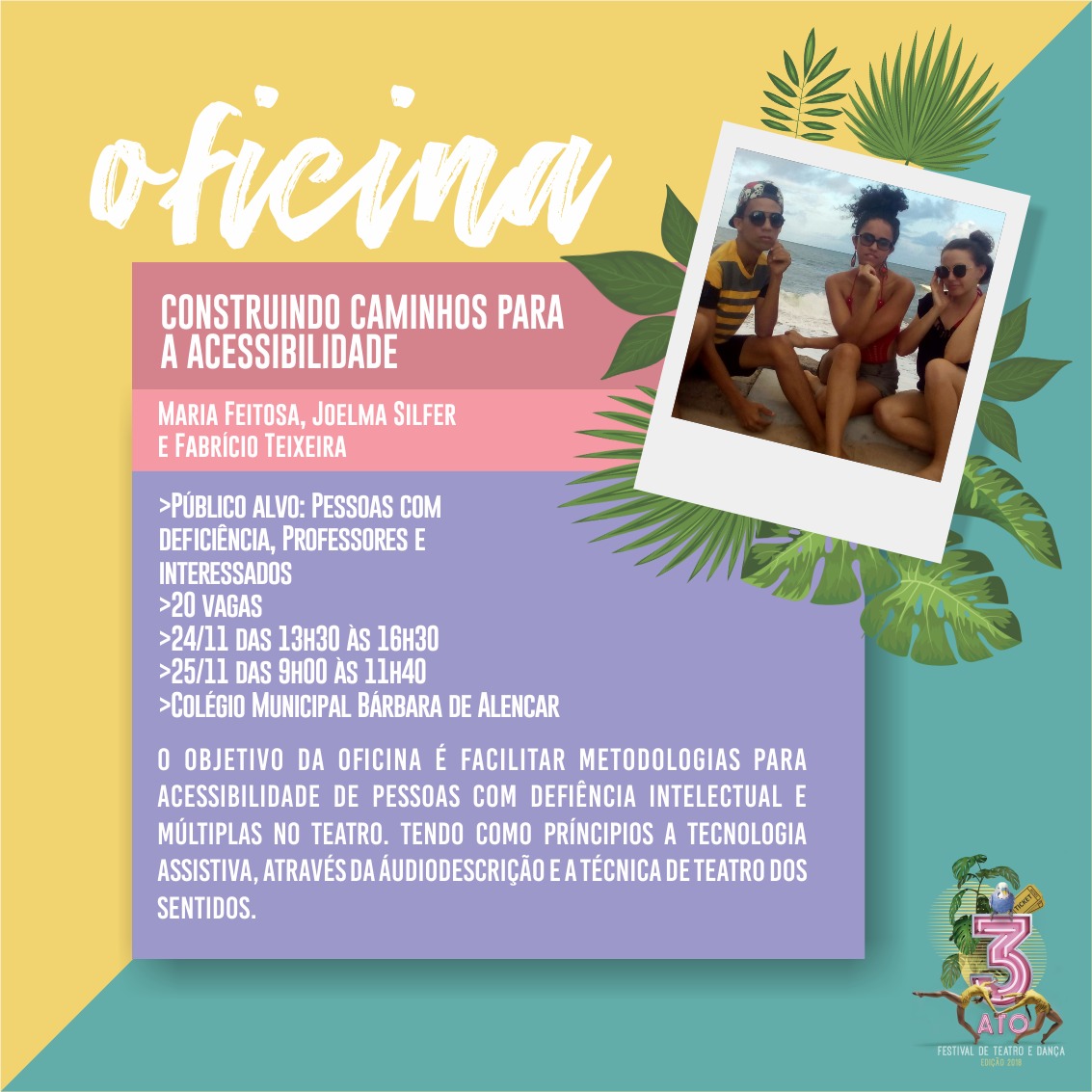 Joelma Silfer é mestra em Artes Cênicas - PPGARC/UFRN, Licenciada em Teatro - URCA, audiodescritora, professora de Teatro, atriz, encenadora e pesquisadora no âmbito Teatro e Acessibilidade. Atualmente cursa Especialização em Ensino do Teatro no IFRN/PAR. Em seus trabalhos prioriza estudos sobre a construção de espetáculos na perspectiva do Teatro multissensorial destinados a pessoas sem e com deficiência visual. Como resultado da sua produção em 2018 foi Homenageada em Recife- PE, pelo X Referendo Microfone Braille, sendo assim reconhecida na categoria de Professora de Teatro Inclusivo.Vídeos