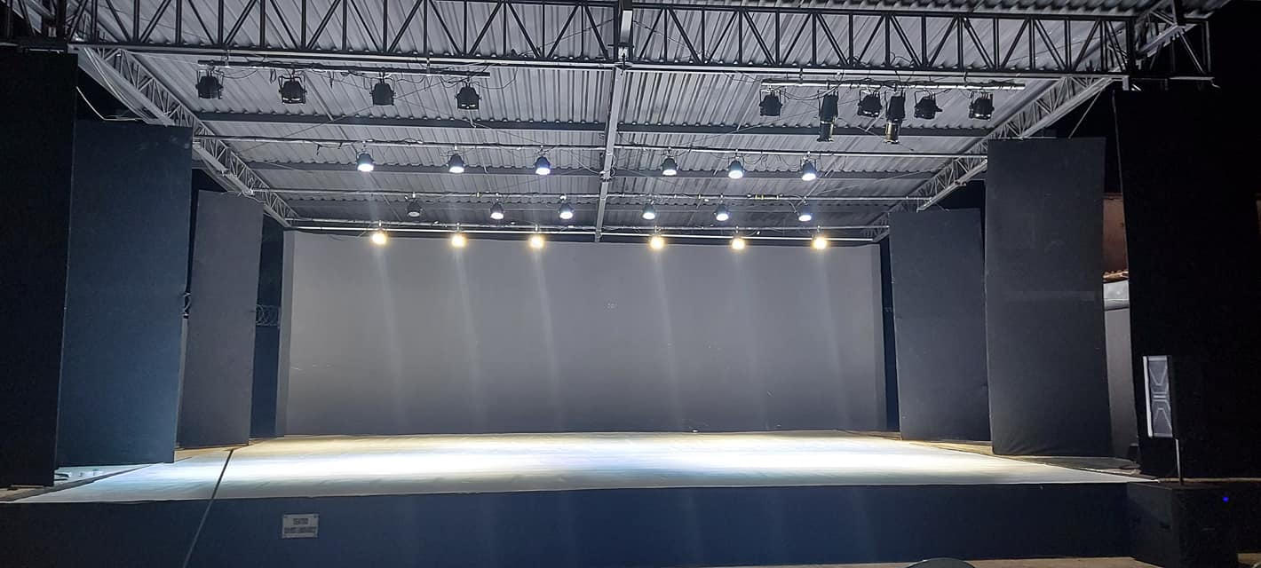 Equipado com iluminação Cênica, Sistema de Som e Linoleo preto, cinza e branco.