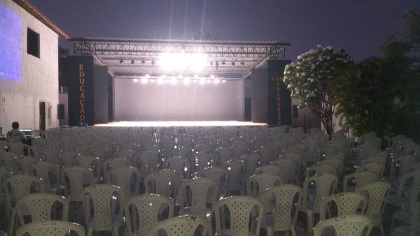Teatro ao ar livre com palco coberto e plateia para cerca de 400 pessoas.
