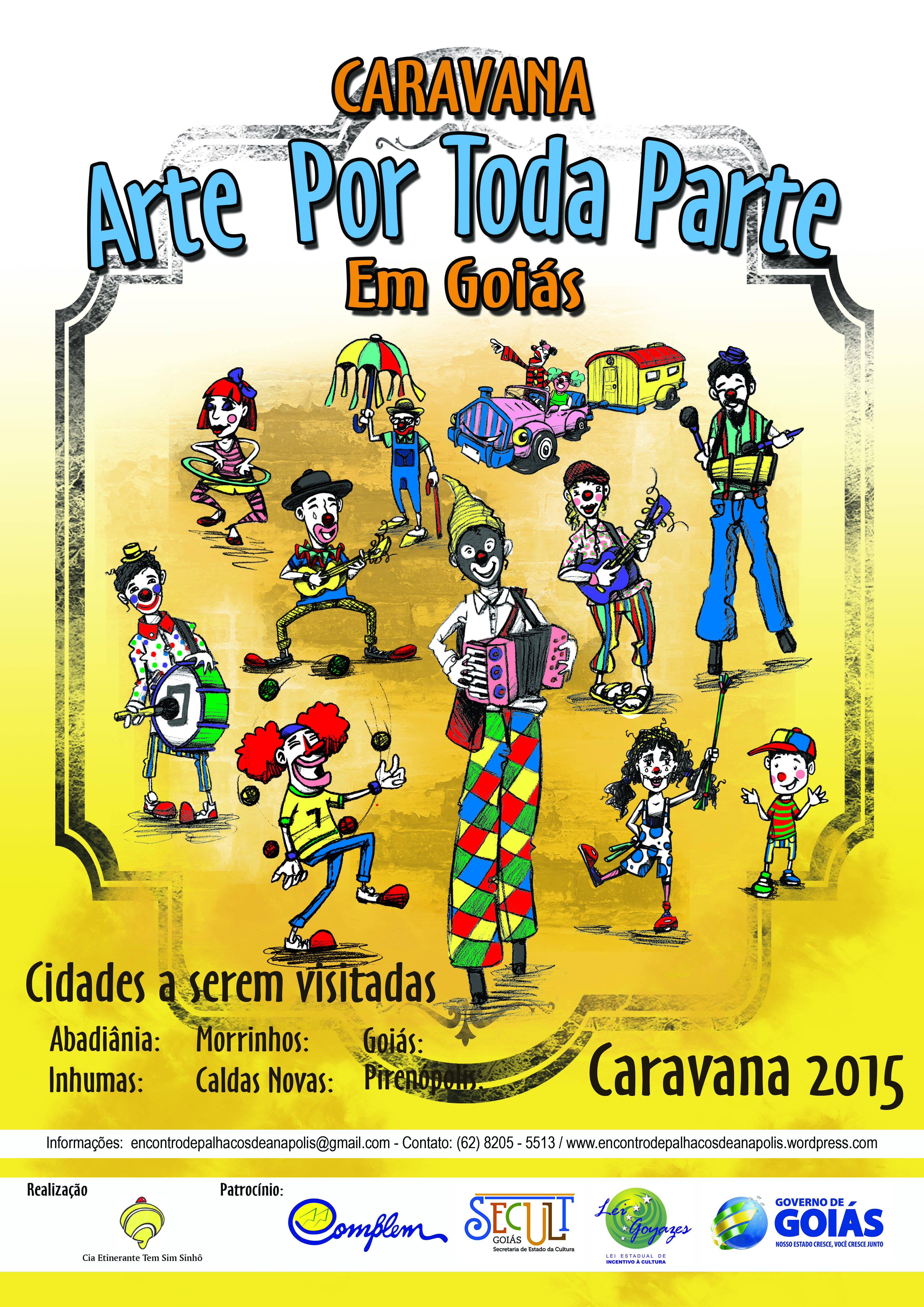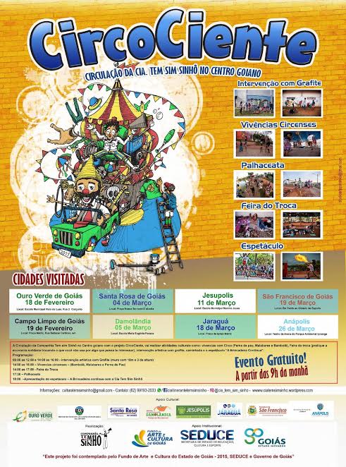 Em 2015 realizou a Caravana Arte por Toda Parte, com oficinas circenses, oficinas de audiovisual e espetáculos nas cidades de: Abadiânia Velha, Inhumas, Morrinhos, Caldas Novas, Goiás e Pirenópolis com patrocínio da Complem, através de benefícios da Lei Goyazes de Incentivo à Cultura; - Apresentações na Mostra Sesc de Teatro em Anápolis; -Campanhas educativas no transito;- Produção e realização de oficina de perna de pau e apresentação do espetáculo “O circo só” no II Festival de Circo de Taquaruçu, Palmas-TO; Realização do Saltinglobes 1° Encontro de Palhaços em Rio Acima-MG dentro da Mostra Gandarela cultural; Eleito Conselheiro do setorial de circo no CNPC; além de produzir o 7º Encontro de Palhaços e Circo em Anápolis.