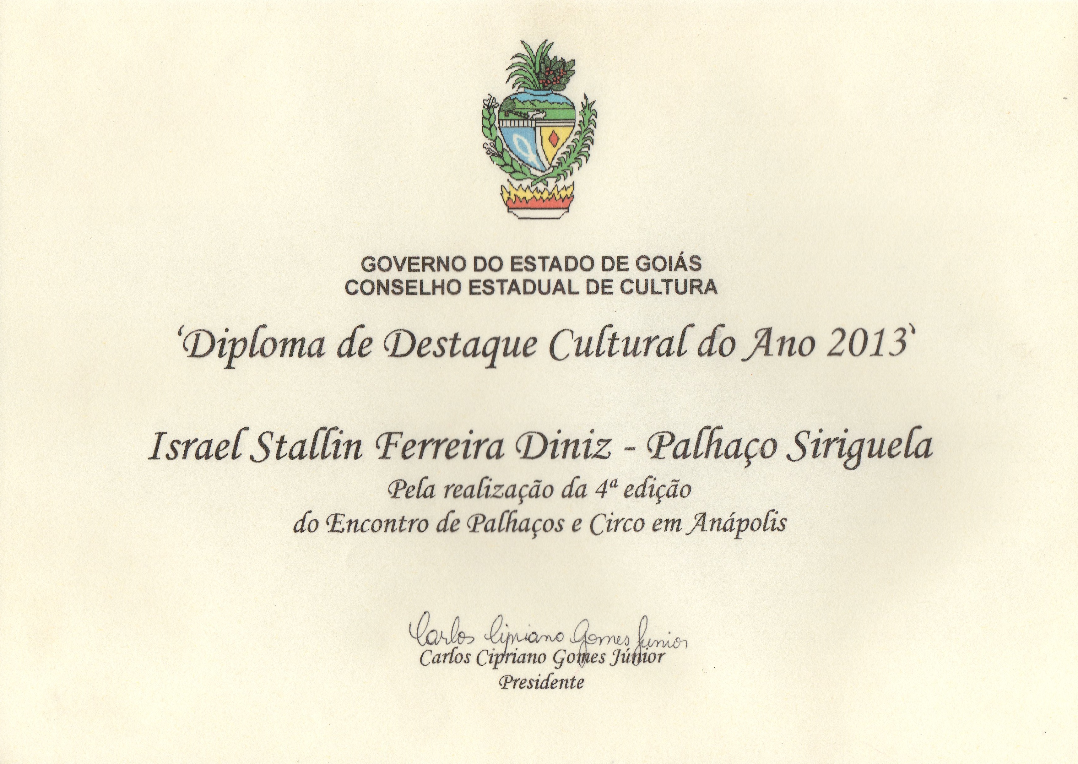 Em 2013 realizou apresentações no estado de Goiás; - Apresentações na Mostra Sesc de Teatro em Anápolis e 2ª Sesc Aldeia Diabo Velho em Goiânia; - Apresentação no 7º Encontro Internacional de Malabares e Circo de Goiás; -Campanhas educativas no transito; - Ministra oficina com perna de pau e apresenta no 2º Na Ponta do Nariz (Encontro internacional de palhaços em Goiânia); - Recebeu o diploma de destaque Cultural do ano 2013, oferecido pelo Governo do Estado e Conselho Estadual de Cultura; além de produziu o V Encontro de Palhaços e Circo em Anápolis.