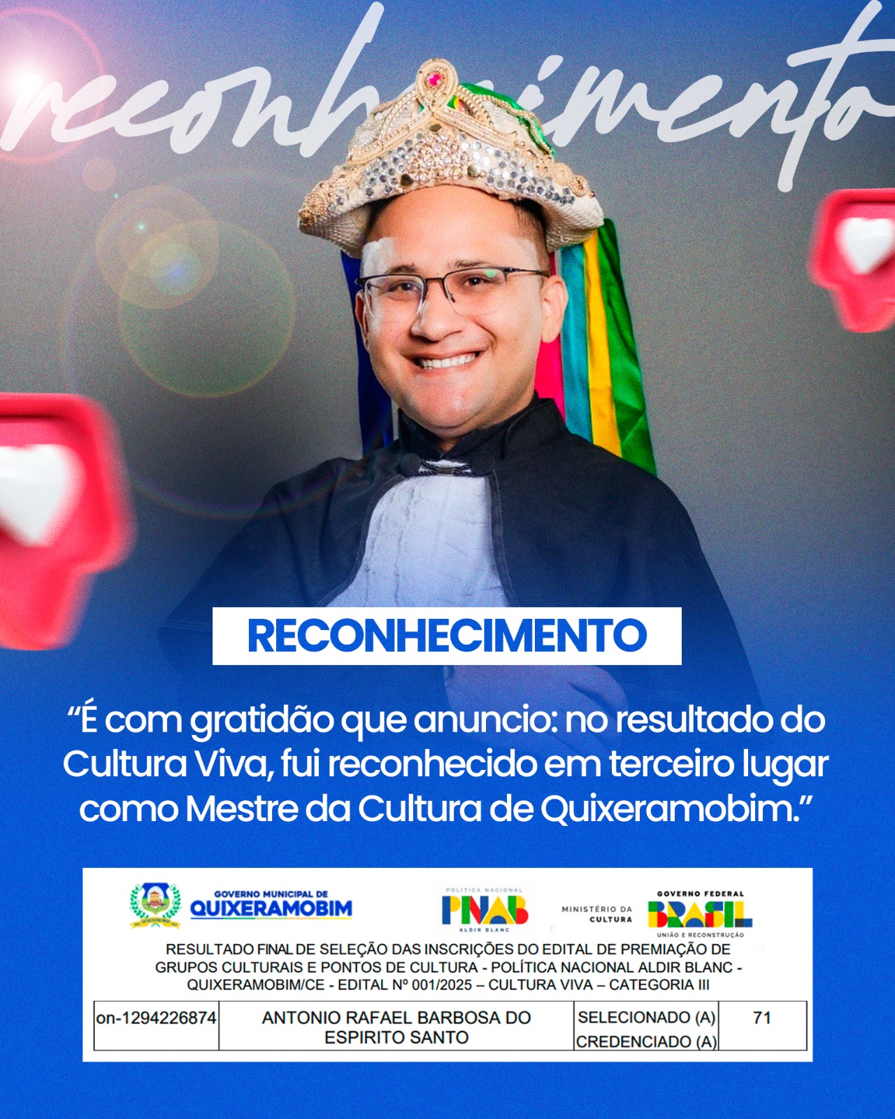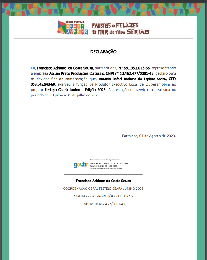 Individual RAFAEL BARBOSA Área de Atuação Arte Digital Arte de Rua Artes Visuais Cultura Digital Cultura Popular Gestão Cultural Pesquisa Produção Cultural Funções Descrição curta MESTRE DA CULTURA - RECONHECIDO PELO MUNIICIPIO DE QUIXERAMOBIM Produtor Cultual. Projetista. Consultor. Mobilizador e Articulador Cultural. Pesquisador. Curador. Avaliador - Presidente de Mesa Parecerista - SECULT -CE/RN/PB/RJ/SP Site: https://www.facebook.com/rafael.barbosa.9465 Sobre Responsáveis Agenda Oportunidades Dados Pessoais E-mail Público: rafaelbarbosa9713@gmail.com Telefone Público: (88) 99949-9902 Endereço: Rua Luis Gomes Coutinho 10, Maravilha, Quixeramobim, CE, BR Estado: CE Município: CEP: 63800-000 Logradouro: Rua Luis Gomes Coutinho Número: 10 Complemento: Casa Bairro: Maravilha Galeria eventos entre e Baixar Planilha CONCLUSÃO FORMAÇÃO PACATUBA Inscrições abertas de 25/10/2025 a 30/10/2025 às 12:00 Denunciar Contato Nome: E-mail: Tipo: Mensagem: Denúncia anônima Receber cópia da denúncia Cancelar Enviar Denúncia Enviando mensagem Nome: E-mail: Tipo: Mensagem: Mensagem anônima Enviar somente para o Responsável Receber cópia da mensagem Cancelar Enviar mensagem Enviando mensagem