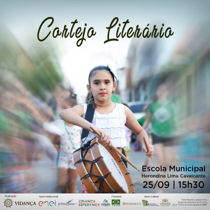 O Cortejo Literário ocorre nesta quinta-feira, 25/09, percorrendo as ruas do bairro Vila Velha. A celebração inicia-se na sede do Vidança, às 15:30h e segue até a Escola Municipal Herondina Lima Cavalcante. Além de contar com apresentação do “Tambatuque DasMarias” e participação e participação do “Tambatuque do Vidança”.