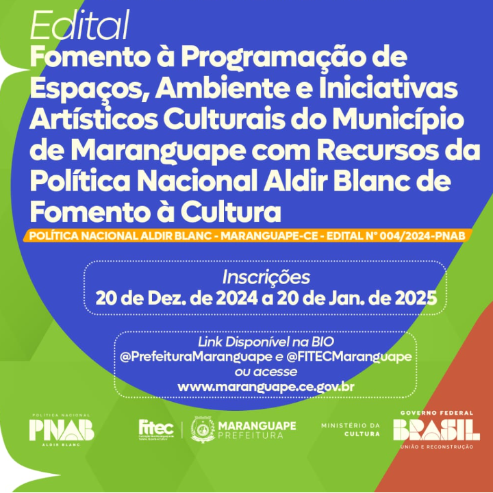 EDITAL DE CHAMAMENTO PÚBLICO PARA FOMENTO À PROGRAMAÇÃO DE ESPAÇOS, AMBIENTES E INICIATIVAS ARTÍSTICO CULTURAIS DO MUNICÍPIO DE MARANGUAPE COM RECURSOS DA POLÍTICA NACIONAL ALDIR BLANC DE FOMENTO À CULTURA – PNAB - MARANGUAPE-CE - EDITAL Nº 004/2024-PNAB