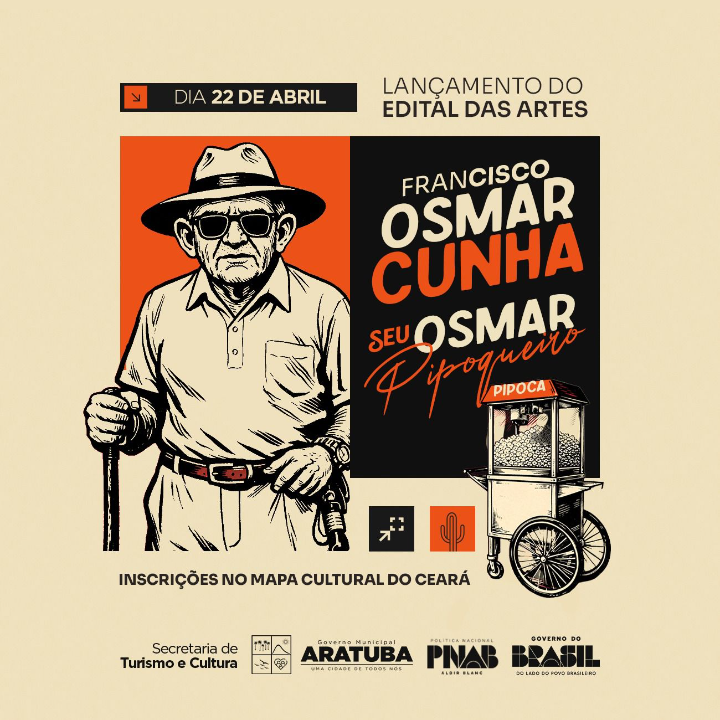 O Edital das Artes Francisco Osmar Cunha — Seu Osmar, Pipoqueiro — celebra a força da cultura aratubense. Com apoio da PNAB, o edital reconhece a importância dos nossos fazedores de cultura, valoriza nossa história e incentiva a produção artística local, mantendo vivo o legado de quem transformou afeto e simplicidade em patrimônio da cidade.