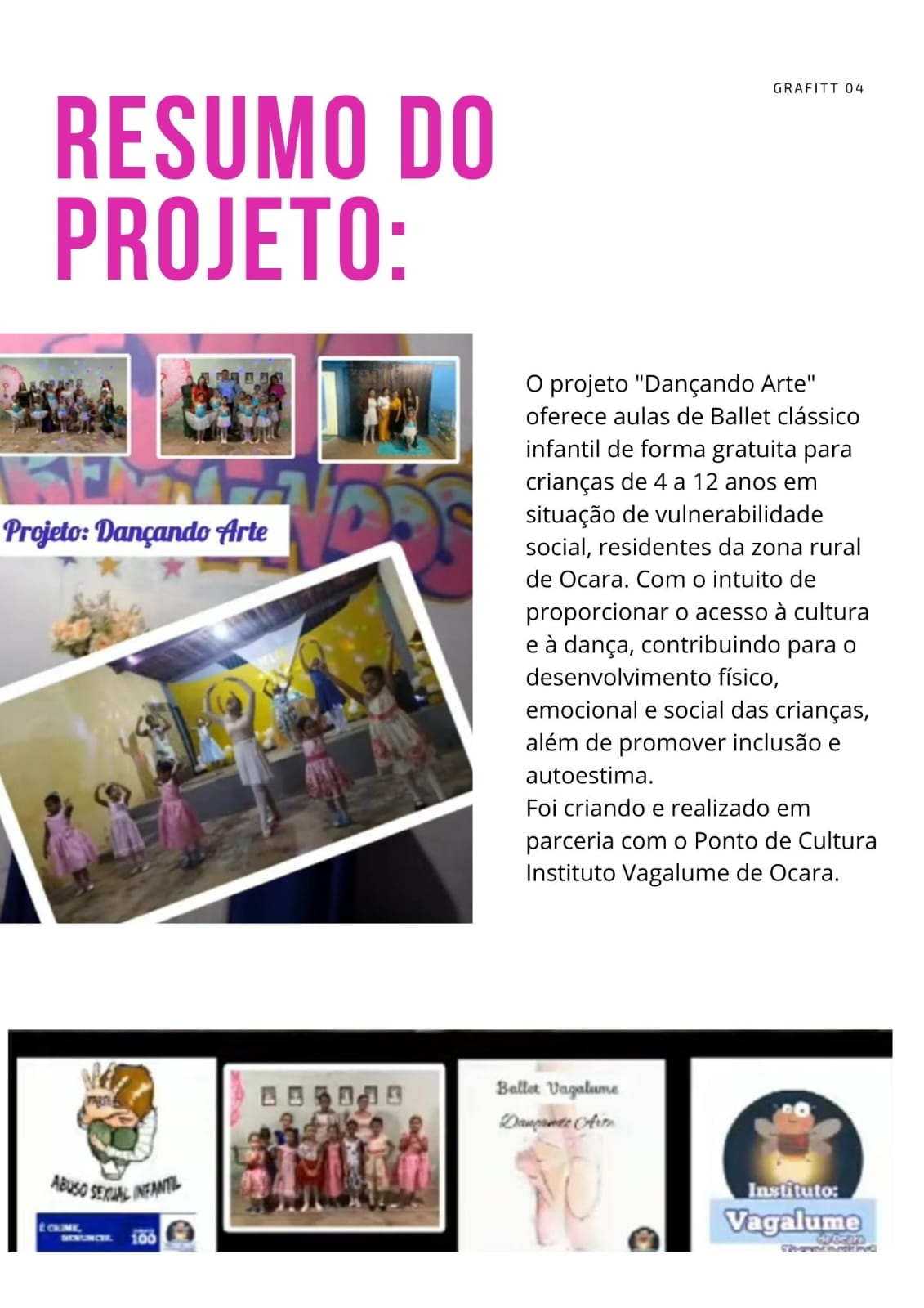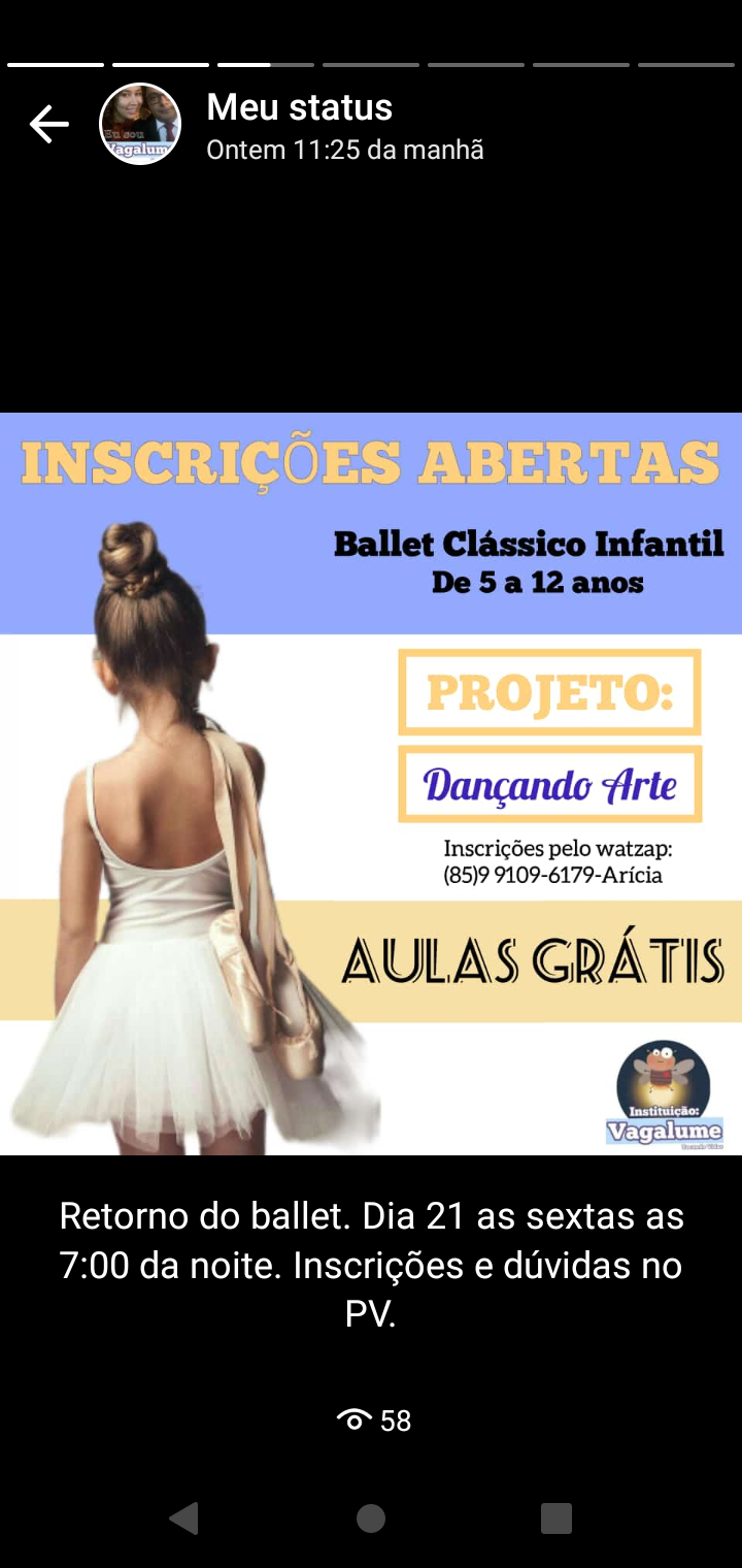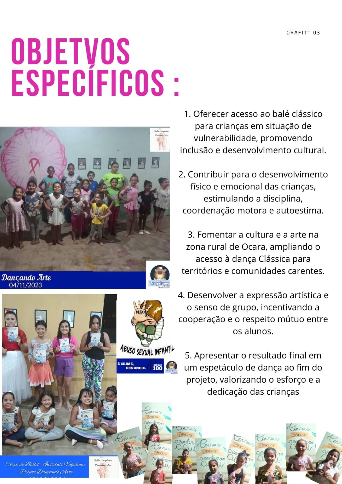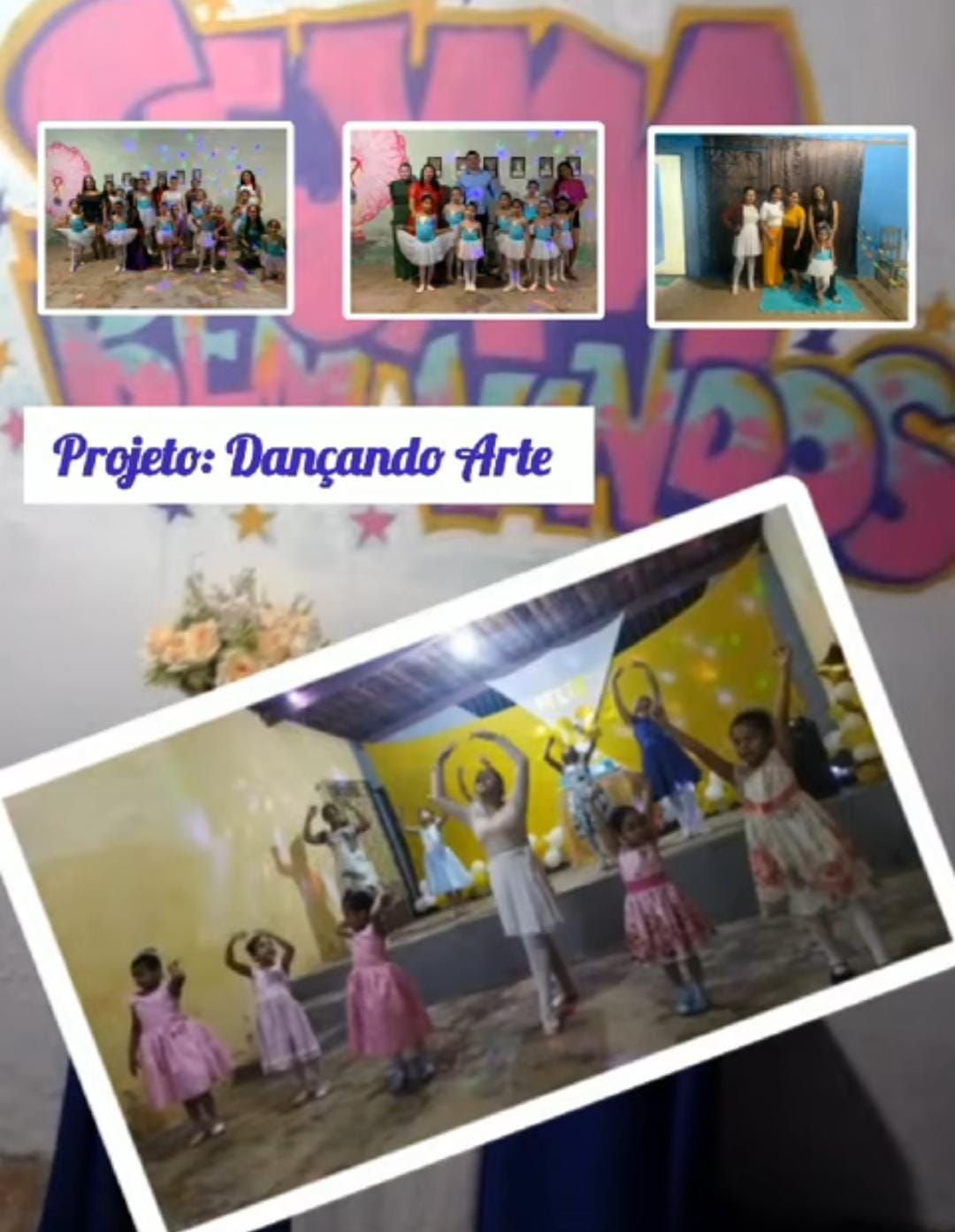O projeto "Dançando Arte" visa proporcionar acesso ao ballet clássico para crianças de 4 a 12 anos em situação de vulnerabilidade ou risco social na zona rural de Ocara, promovendo o desenvolvimento cultural, físico e emocional através da dança. Com uma abordagem inclusiva, o projeto busca incentivar a disciplina, a autoestima e o senso de grupo, utilizando a arte como ferramenta de transformação social e cultural, além de proporcionar um espaço seguro para a expressão artística dessas crianças.Galeria
